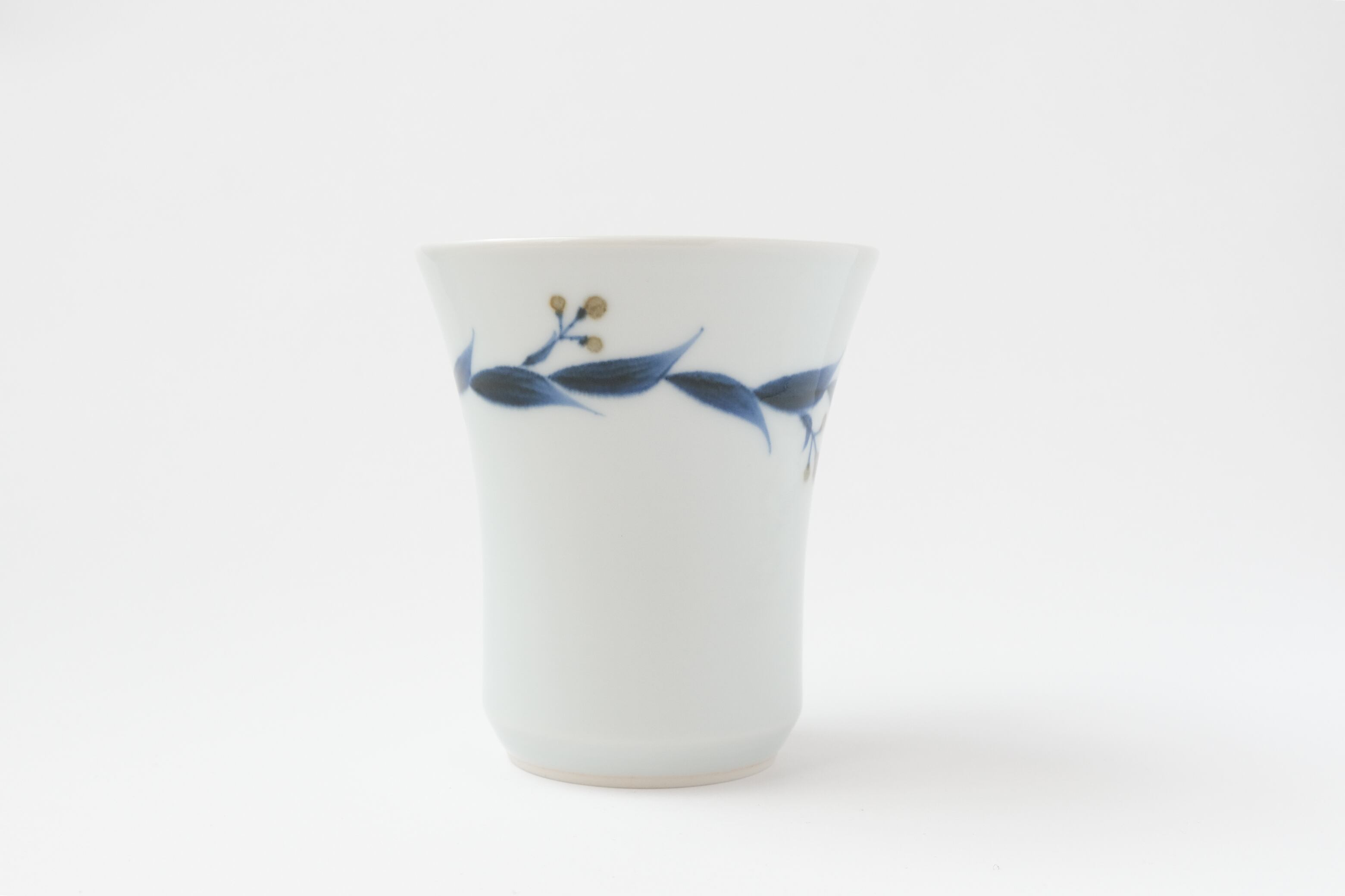 イネ科の植物の葉からインスピレーションを受け、細い胴体に口が広がっているのが特徴のカップです。持ちやすく飲みやすい形になっています。ビールやアイスコーヒーなど冷たい飲み物はもちろん、温かいコーヒーやお茶などにも使えます。外側には弦を巻き伸びている植物を描いています。実を結ぶことを意味し、所々に茶色い実が存在しています。白の生地に茶色い実が落ち着いた印象を与えます。作陶と絵付を女性二人分業で行っています。