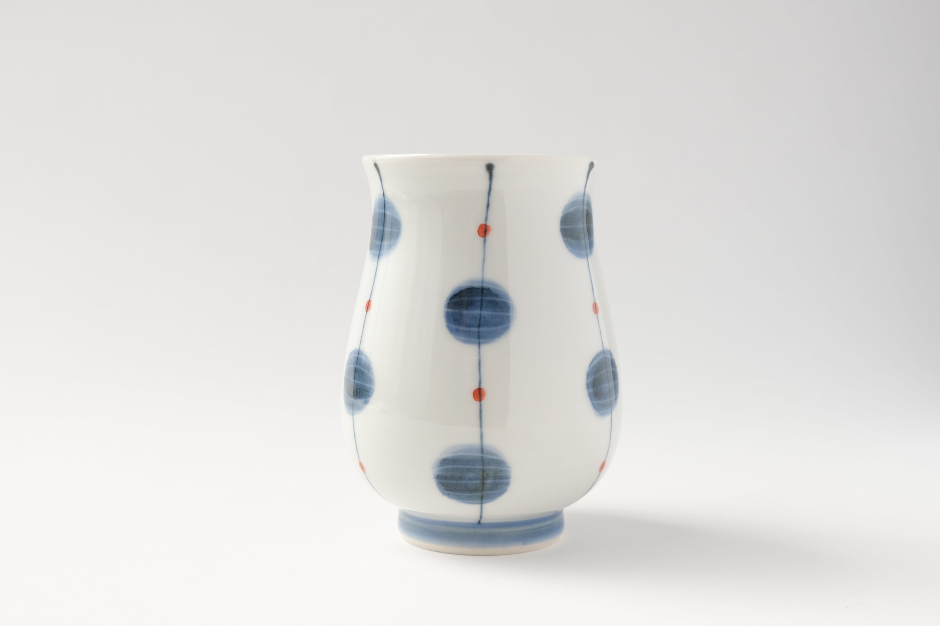 ぽってりとした丸みが手になじむお湯呑です。大き目のサイズなのでたっぷり飲み物を入れることができます。上の部分がくびれているので持ちやすさが特徴です。食事のお茶やコーヒー、紅茶、アイスやホットでも使いやすいカップです。外側に赤がチャームポイントの玉模様を描いています。五穀豊穣を願う縁起物の餅花がモチーフとなっています。老若男女問わず人気の柄です。作陶と絵付を女性二人分業で行っています。