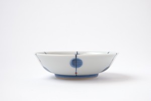 一品盛り付けたり、個々にお料理を取り分ける取り皿として便利な器です。少し深みもあるので、煮汁があるものも安心です。内側から外側にかけて、赤がチャームポイントの玉模様を描いています。五穀豊穣を願う縁起物の餅花がモチーフとなっています。老若男女問わず人気の柄です。余白を中心に残し、玉模様がお料理を引き立てます。作陶と絵付を女性二人分業で行っています。